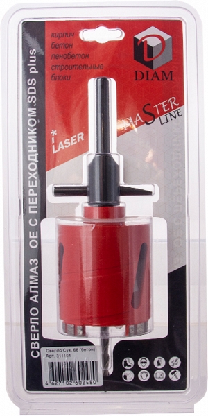 Коронка для подрозетников по бетону с переходником M16/SDS-Plus Diam Master Line 68 мм (Диам Мастер Лайн 68 мм) – алмазное сегментное кольцевое сверло для ручного сухого сверления глухих подрозеточных отверстий Ø 68 мм в стенах из кирпича, неармированного и слабоармированного бетона без применения охлаждающей жидкости. Лазерная сварка алмазных сегментов обеспечивает надежное соединение сегментов и корпуса сверла, что практически исключает отрыв сегмента в процессе сверления.