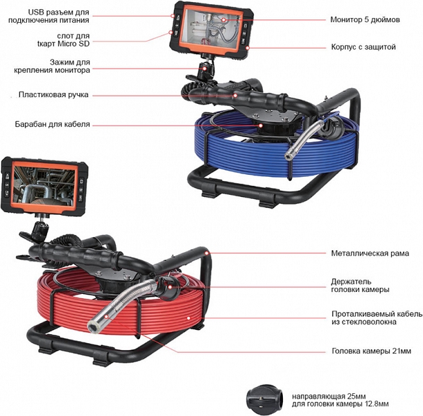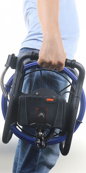 - 12,8 мм головка камеры и 30 м проталкиваемый кабель из стекловолокна Ø 4,8 мм, подходящий для труб Ø 32 – 65 мм